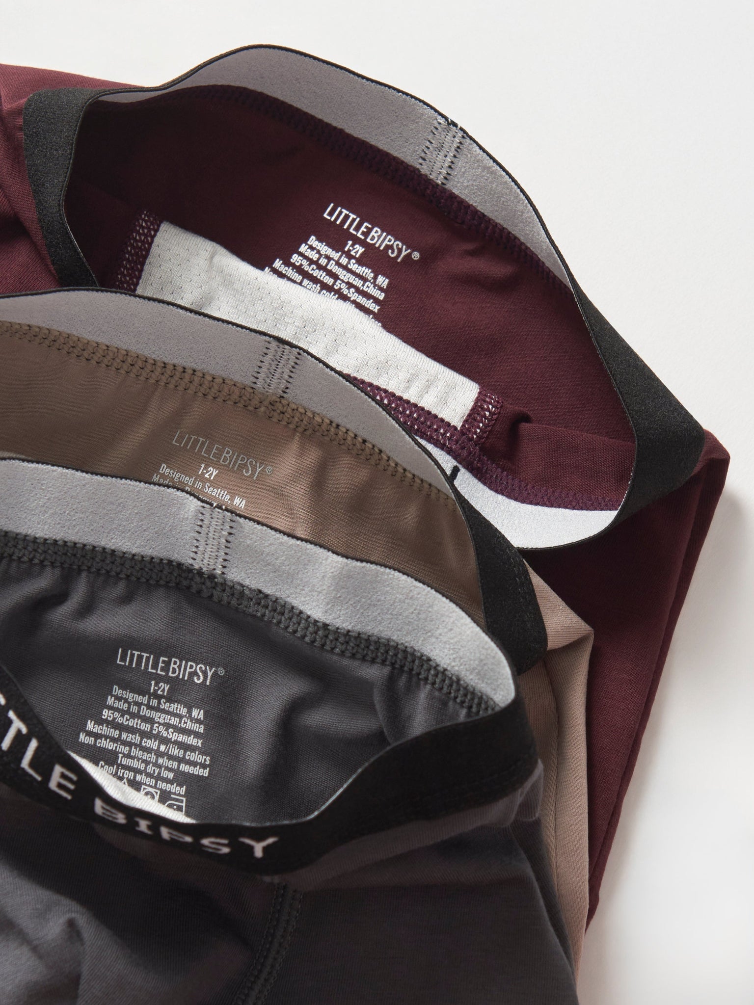 Our Boxer Brief 3-Pack offers comfort and style for your little one. This pack option comes in Shadow, Mushroom, and Huckleberry, providing a perfect fit and breathable fabric for all-day wear. Available in sizes 1-2Y to 10-12Y.