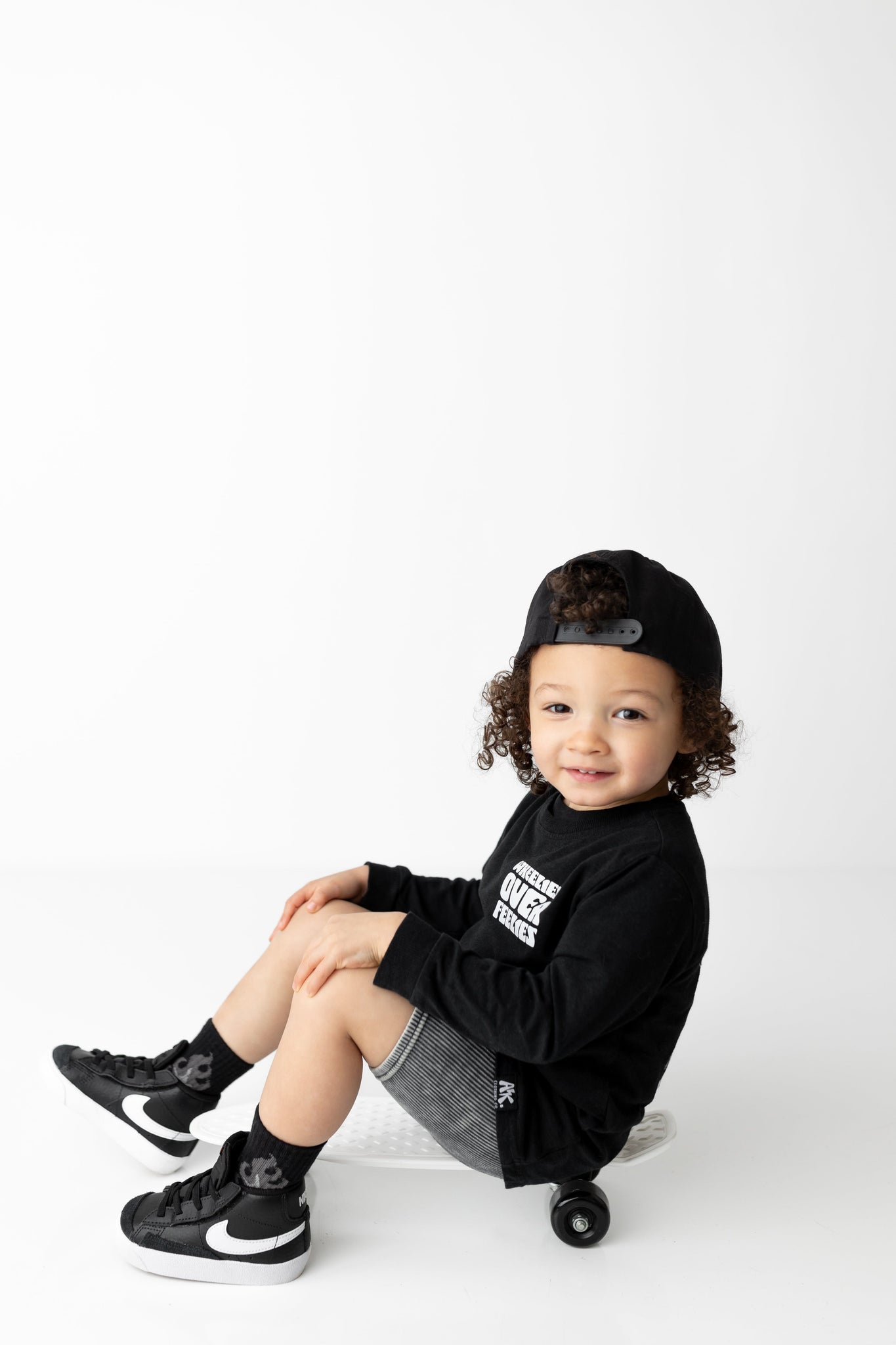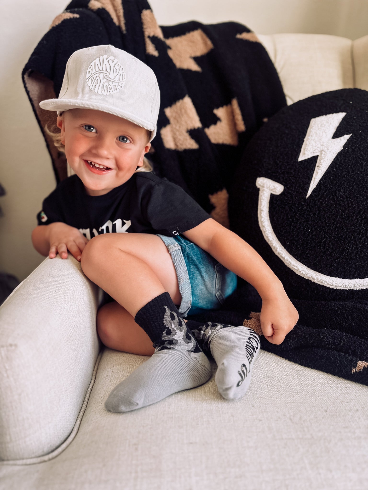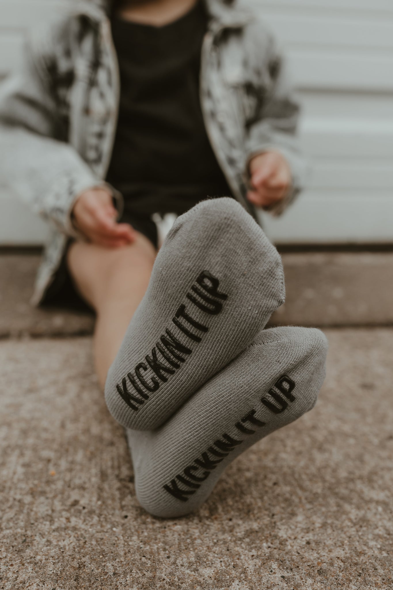 Sizes Infant, Extra Small, Small, Medium have logo grips on the bottom of the feet large have a stitched logo on the bottom of the feet.