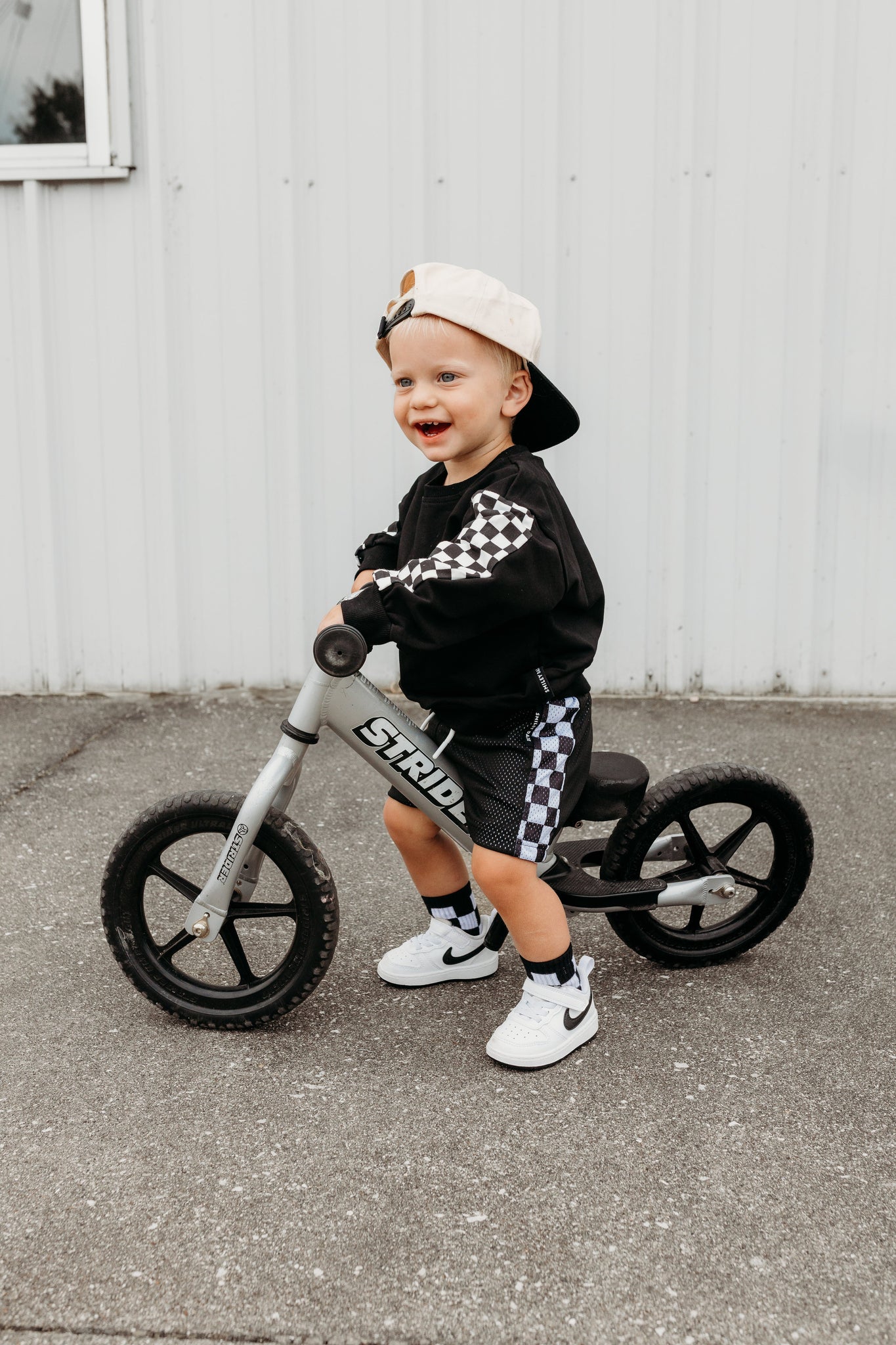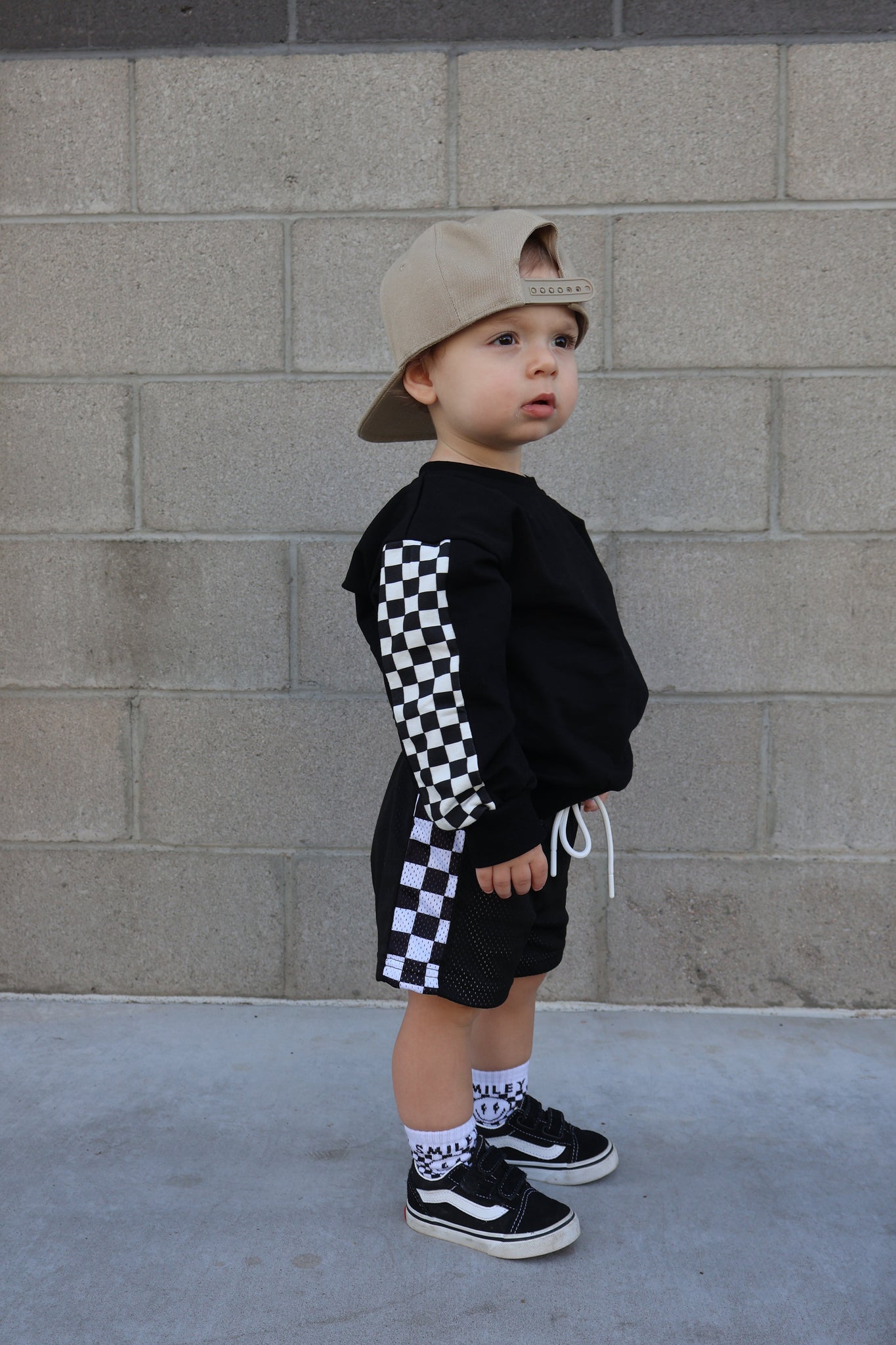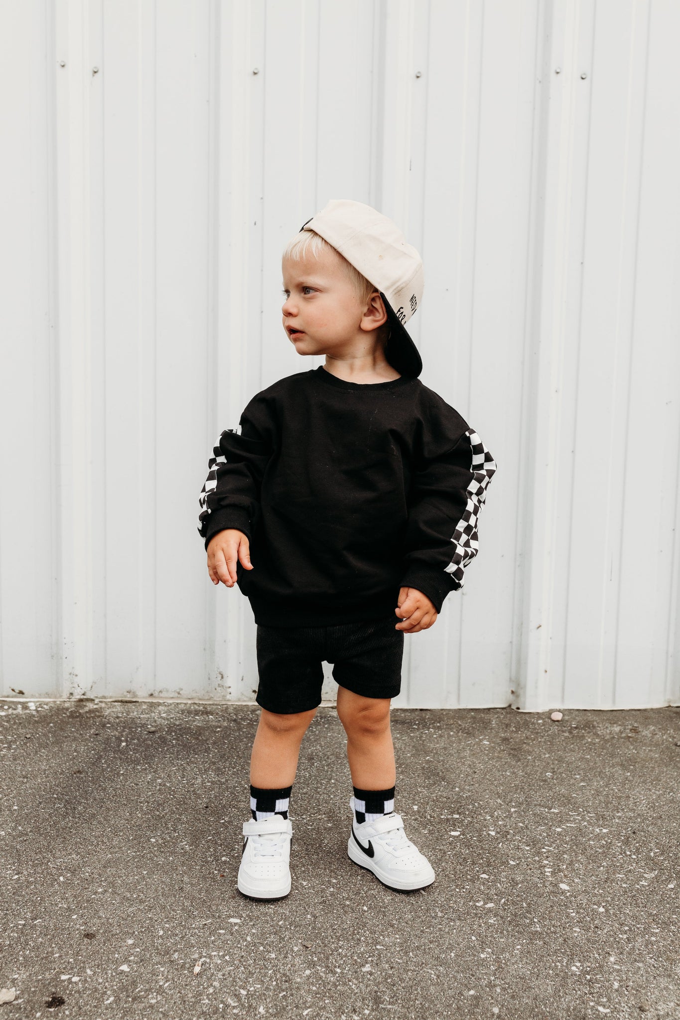 Turn up the style and let your little one lead the pack in the Midnight Crew — a bold black crewneck built for high-energy kids with high-voltage style. Featuring standout checkered sleeves and an ultra-comfy fit, this piece brings the perfect mix of cool and cozy to their everyday rotation.