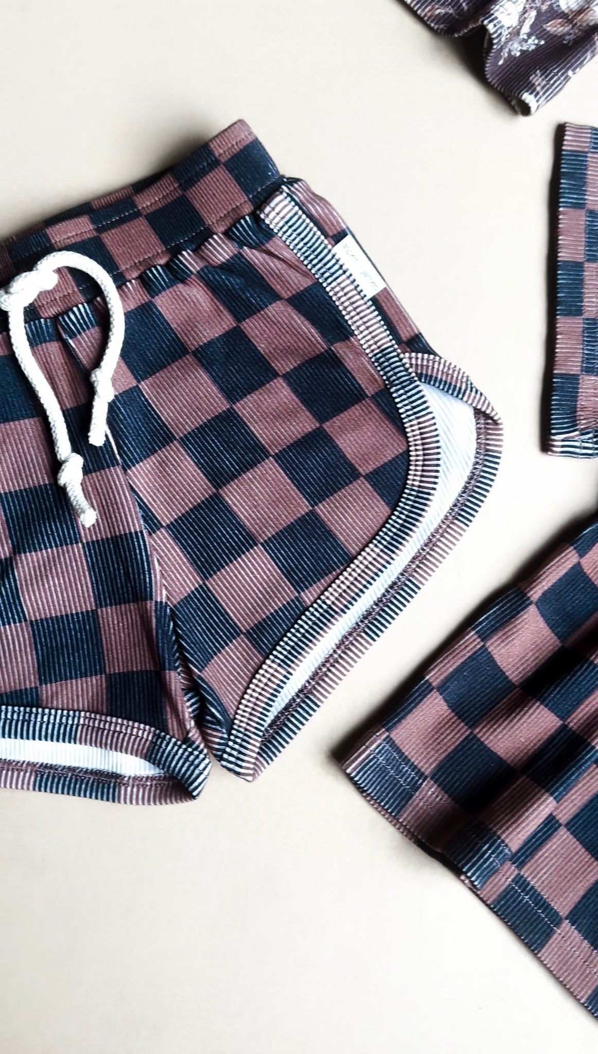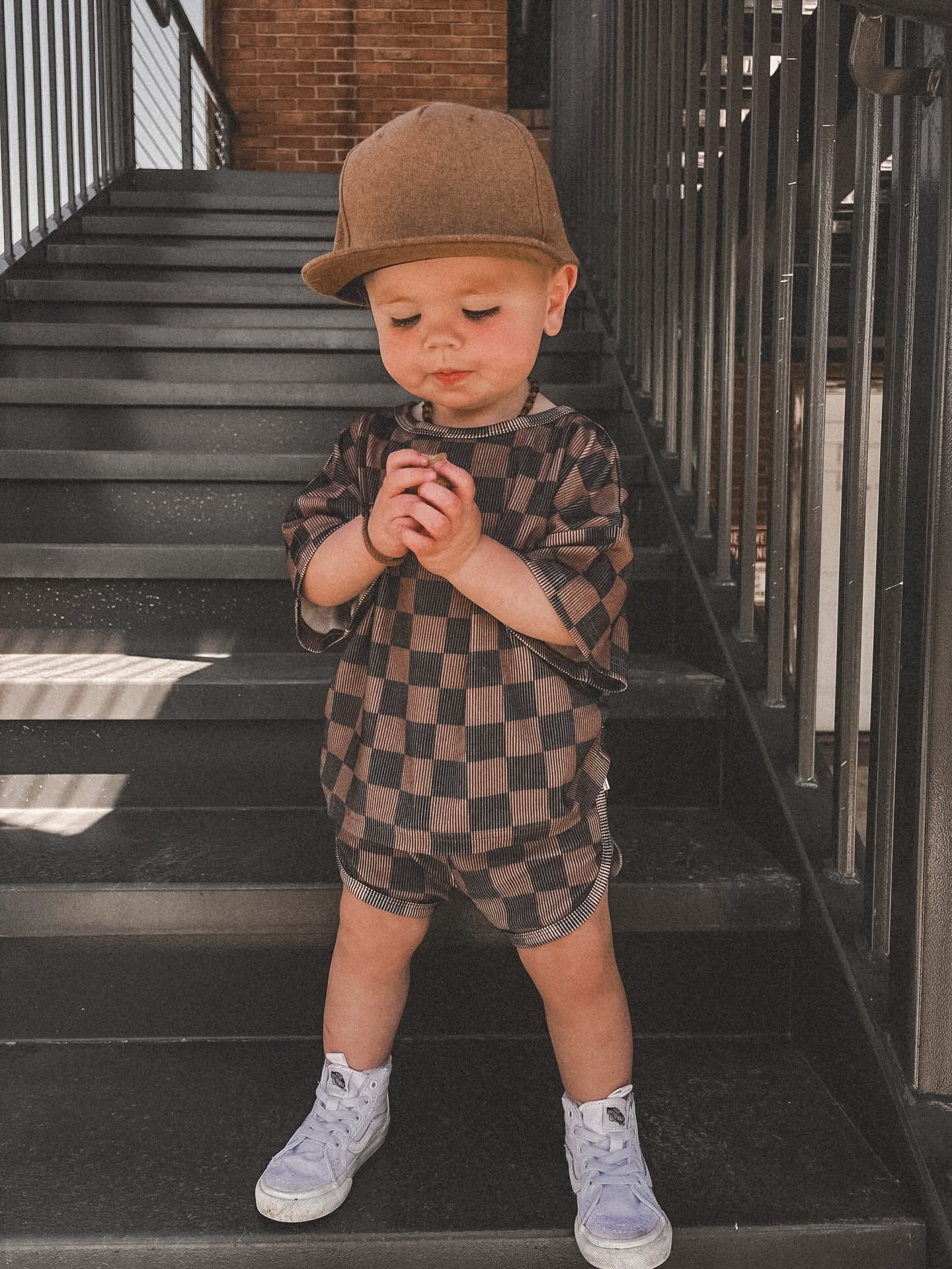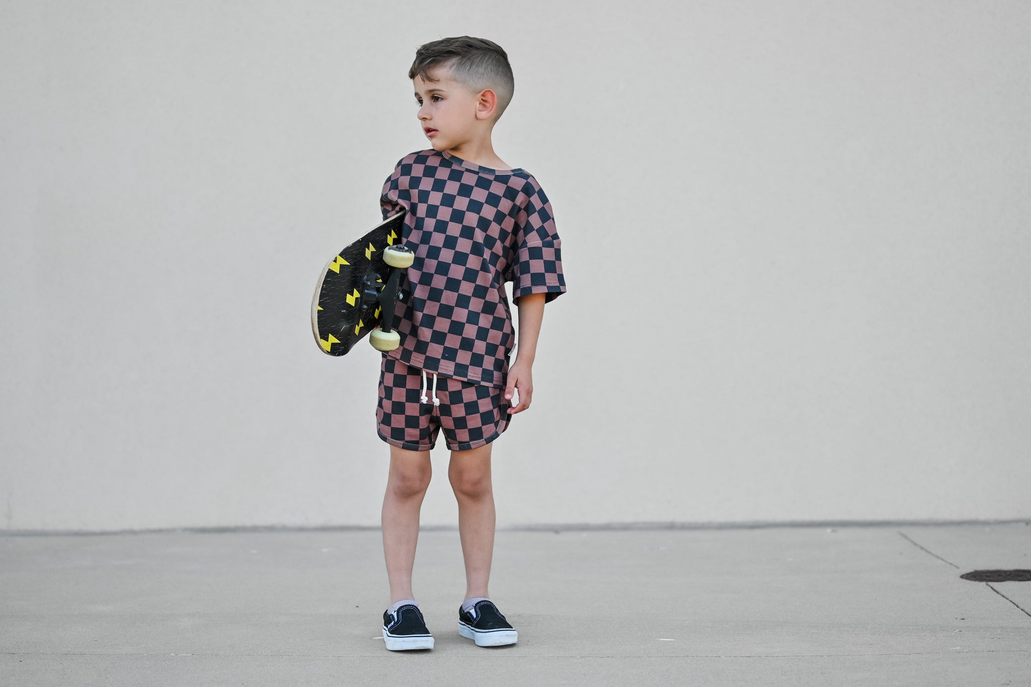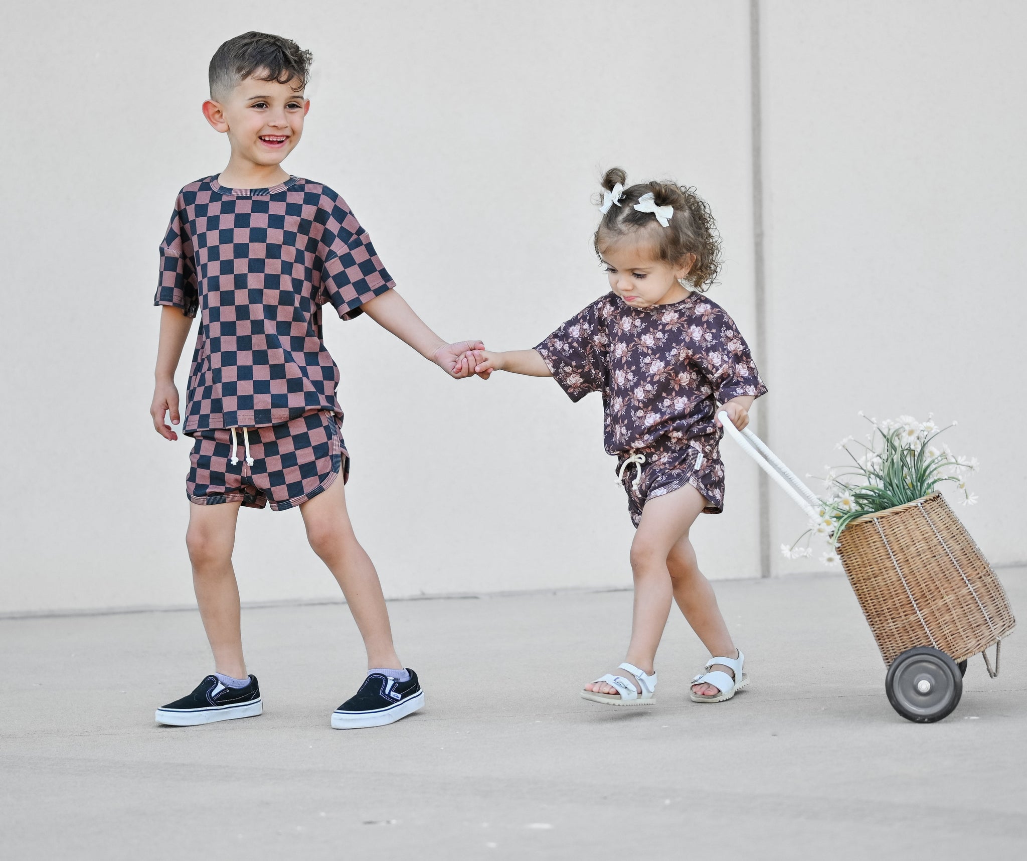 This will be your kiddo's favorite outfit this summer! This fabric is truly luxury made for babies and toddlers, gentle on skin, ultra light-weight and soft as silk! This custom blend of Bamboo/Cotton/Spandex falls perfectly with an over-sized, breezy fit top, featuring a drop shoulder and wide sleeve openings. The track shorts have a wide elastic waist band for comfort and no digging-in, and have a slightly-snug fit to contrast the loose top. The shorts in this checker print are a tad longer than the floral print as we know this set will be a go-to for the boys, but it’s also perfect for sibling matching!