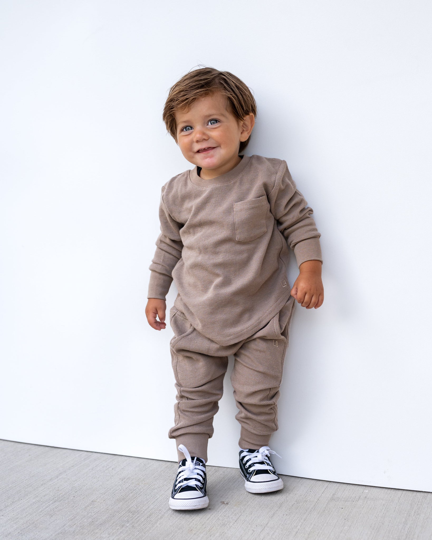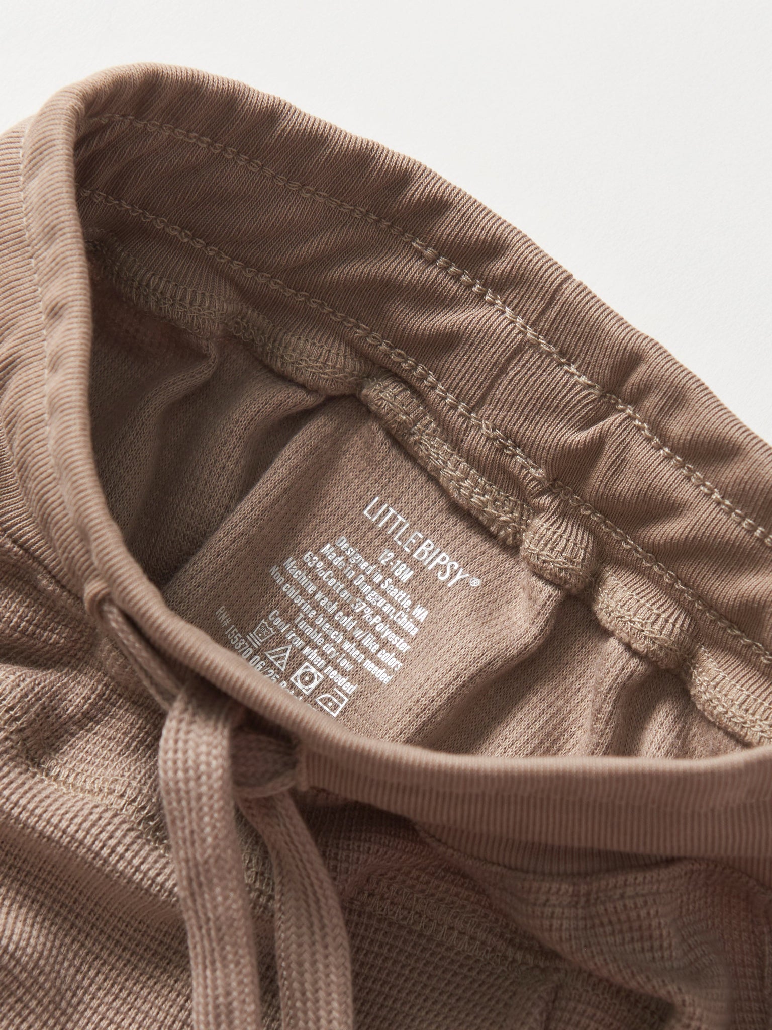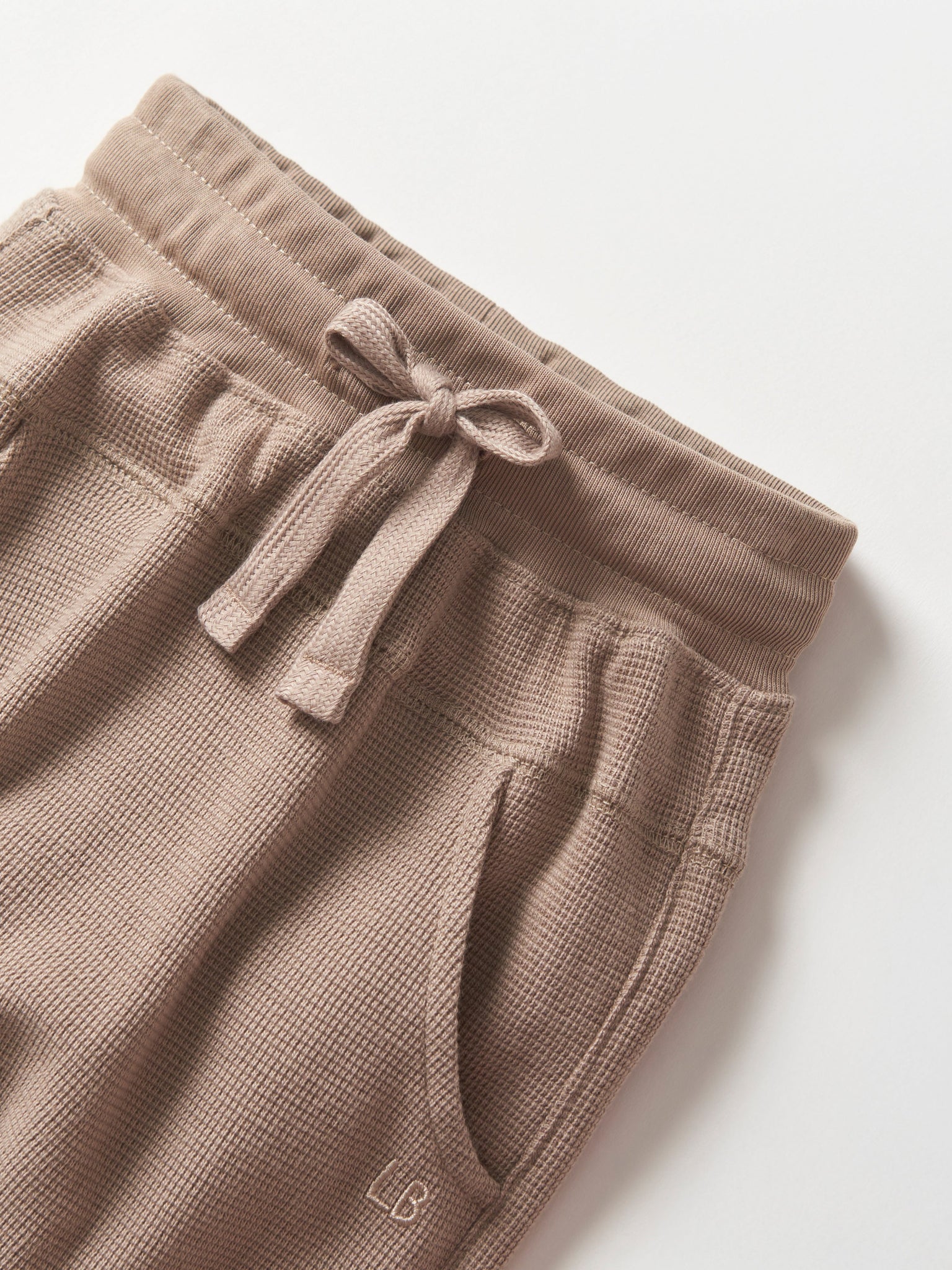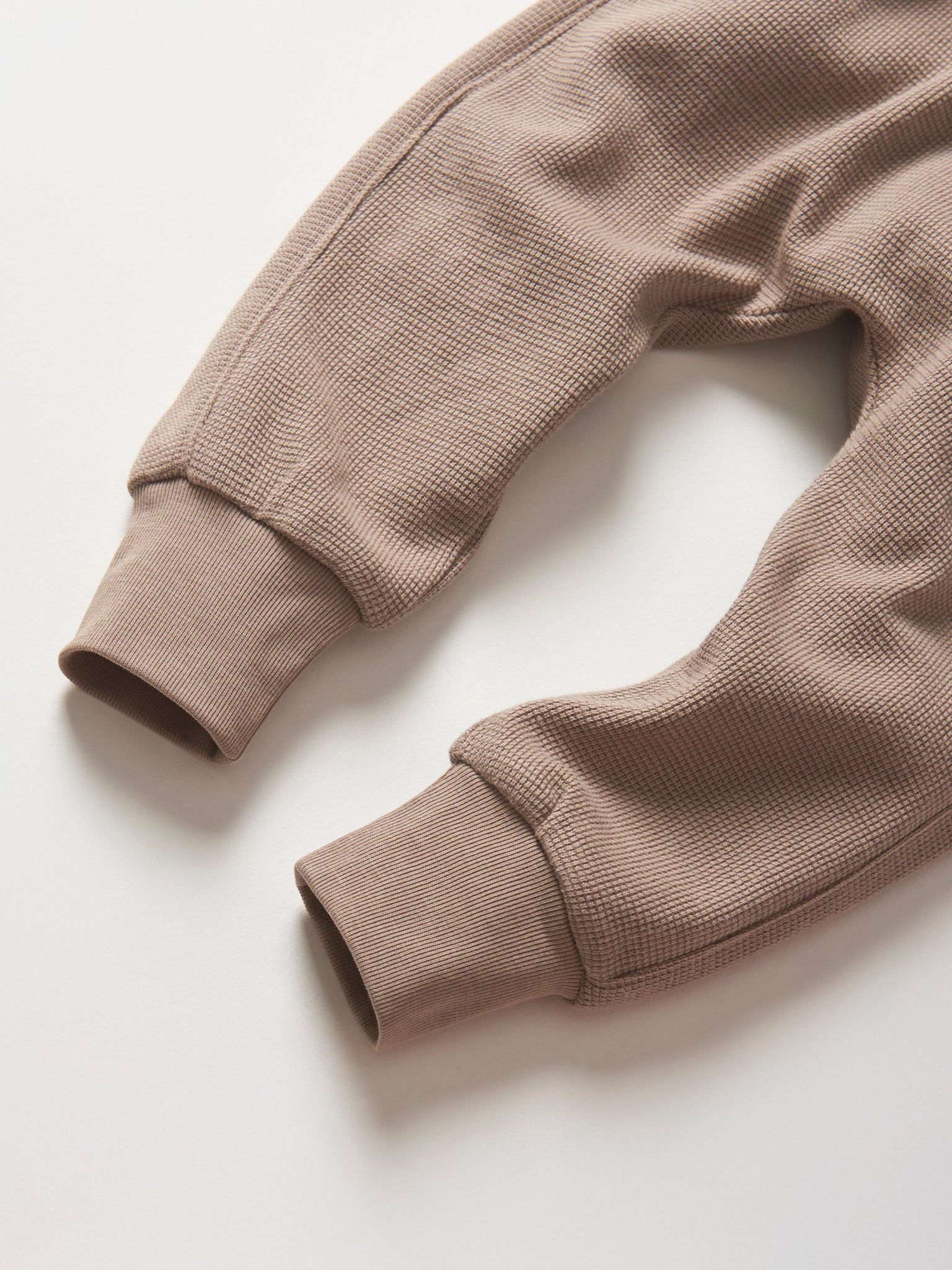 Complete the look with our Waffle Joggers, designed to match perfectly with our Waffle Tops. Available in Shadow, Mushroom and Huckleberry these joggers feature an adjustable drawstring waist and a relaxed fit for maximum comfort. The ribbed cuffs add a snug touch, making them the perfect cozy option for cooler weather. Available in sizes 0-3M to 12Y