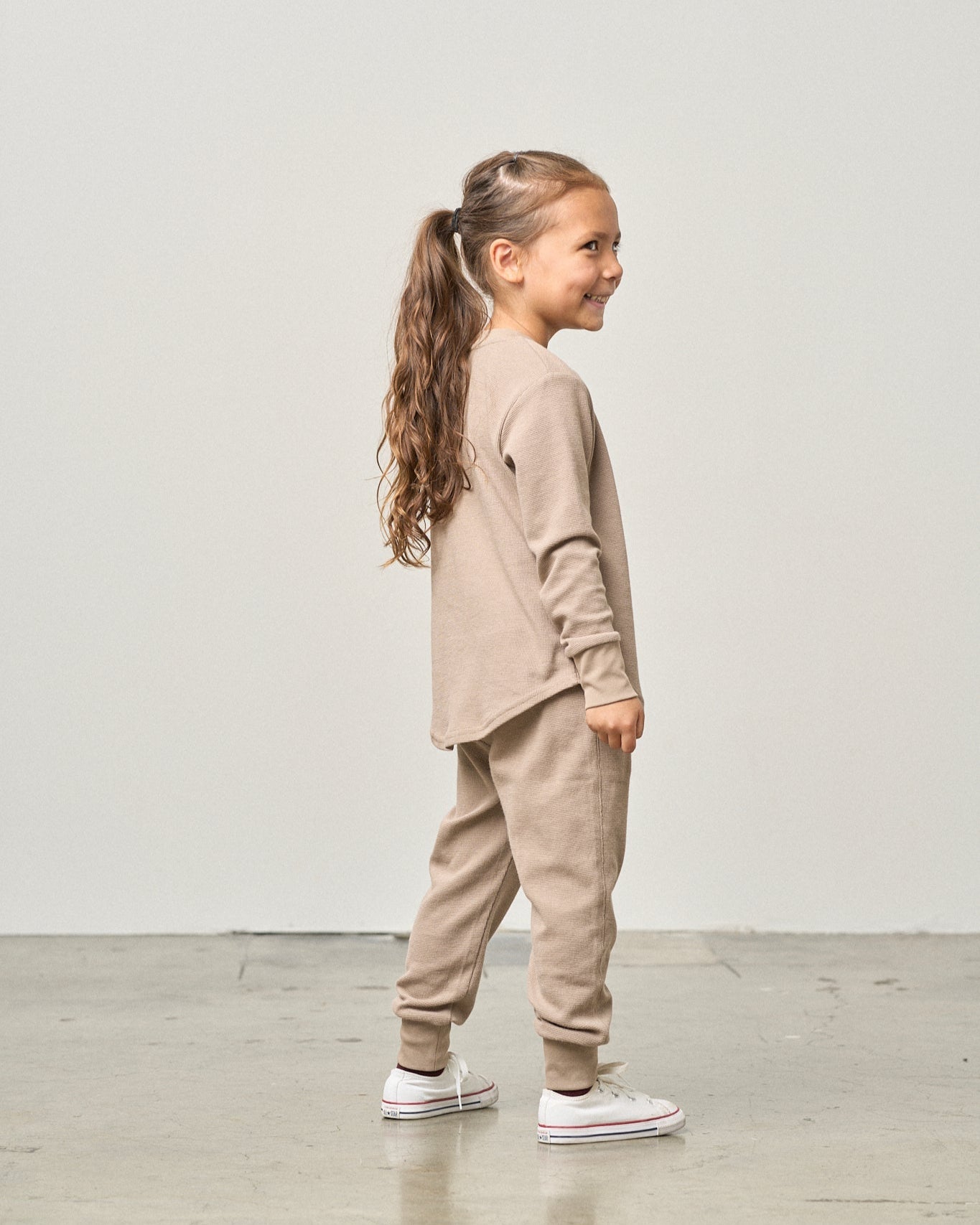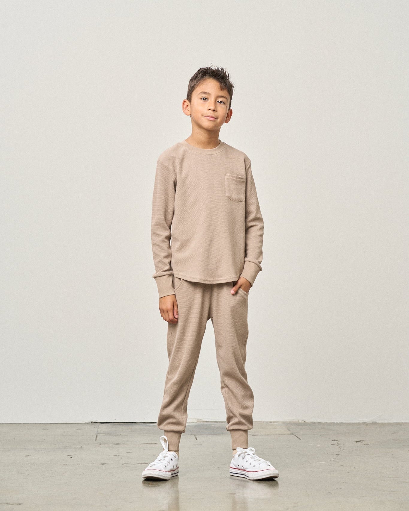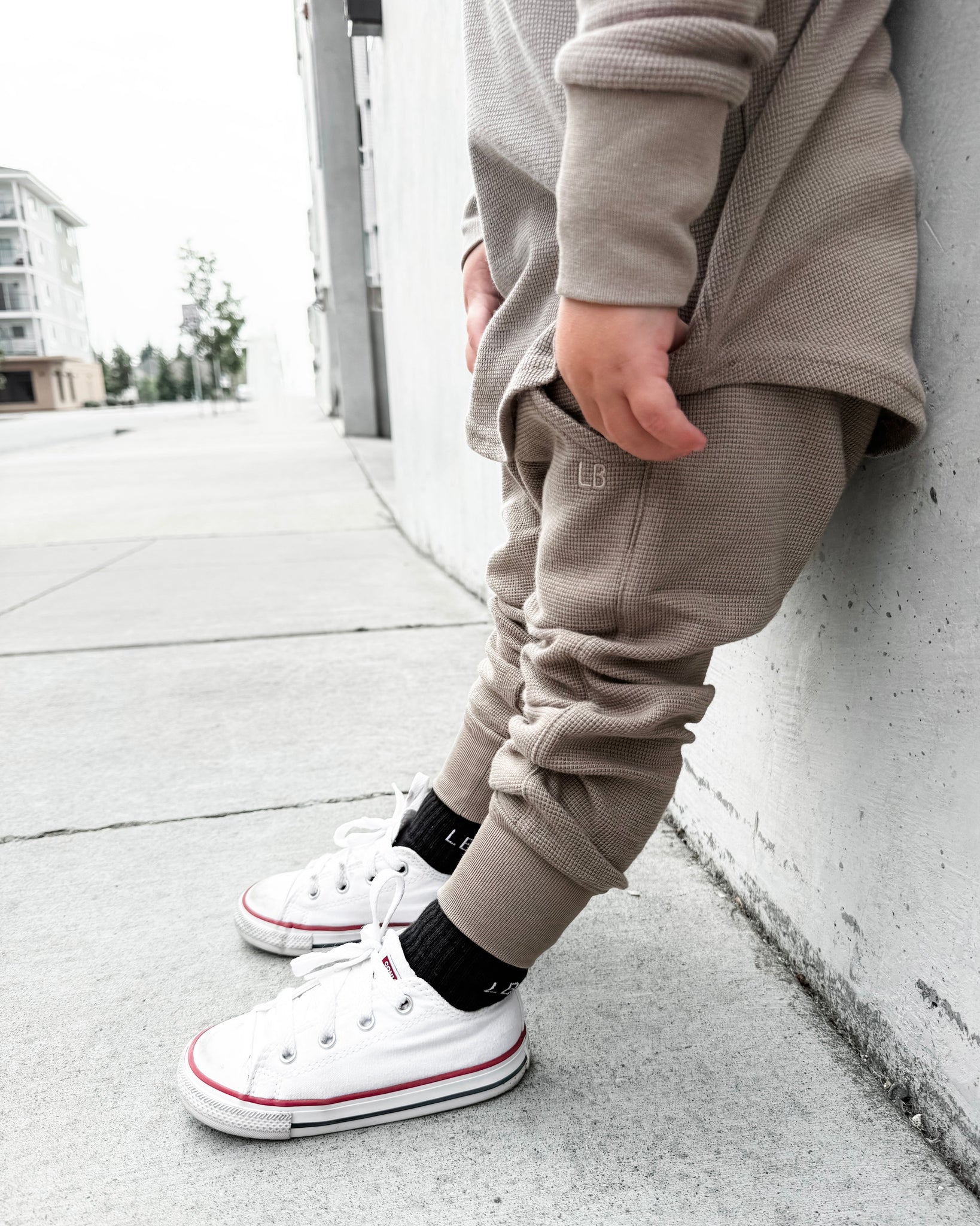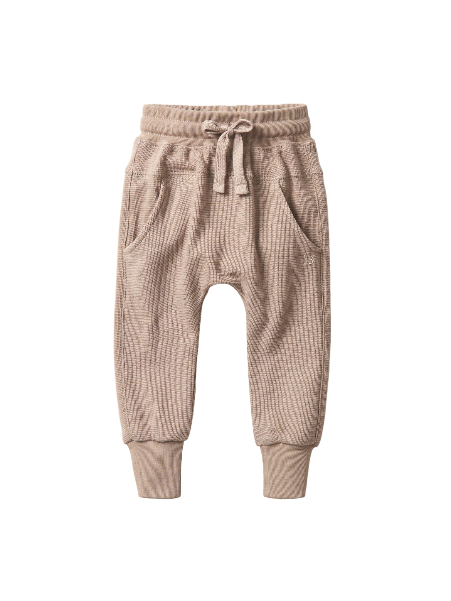 Complete the look with our Waffle Joggers, designed to match perfectly with our Waffle Tops. Available in Shadow, Mushroom and Huckleberry these joggers feature an adjustable drawstring waist and a relaxed fit for maximum comfort. The ribbed cuffs add a snug touch, making them the perfect cozy option for cooler weather. Available in sizes 0-3M to 12Y