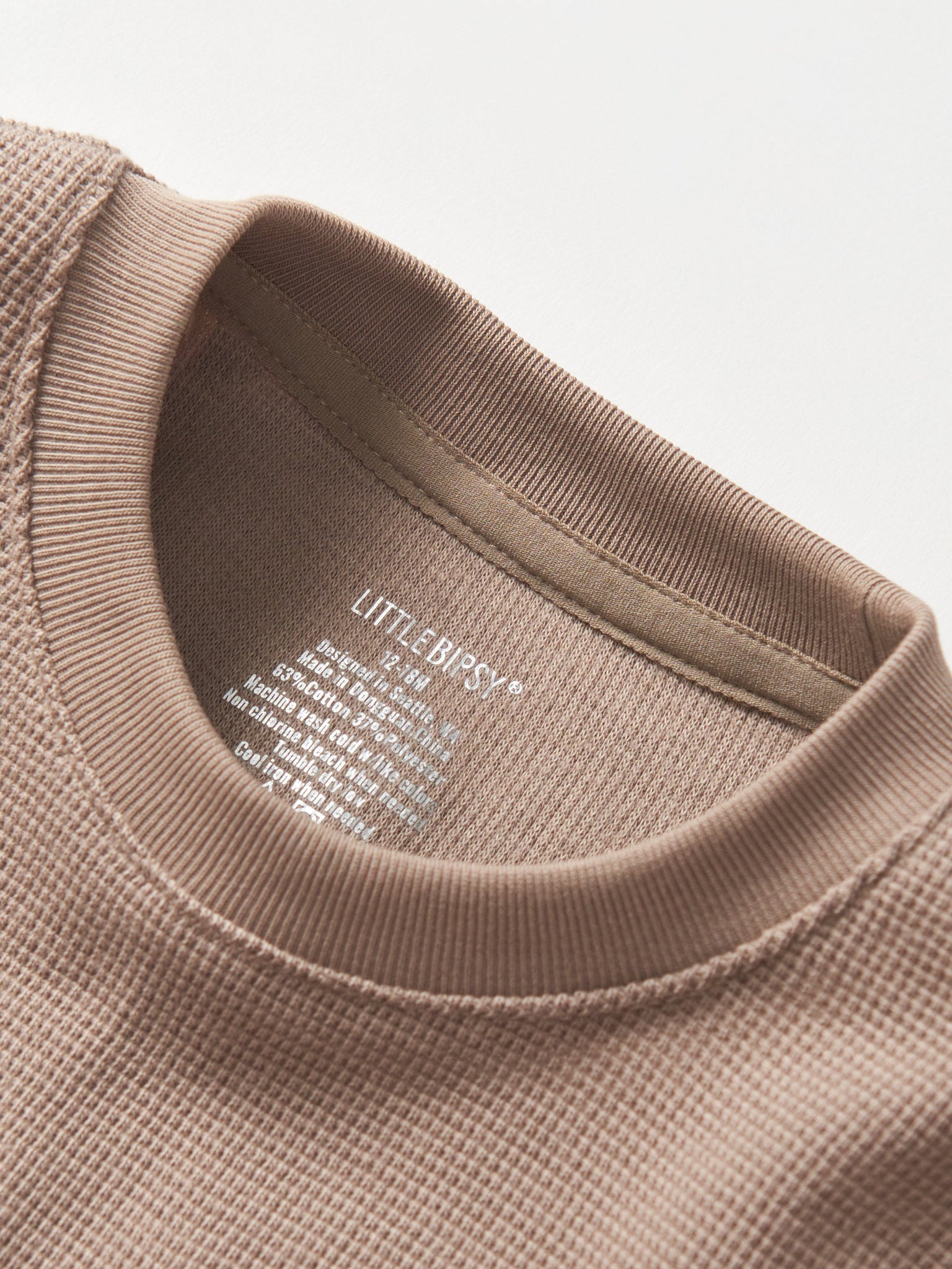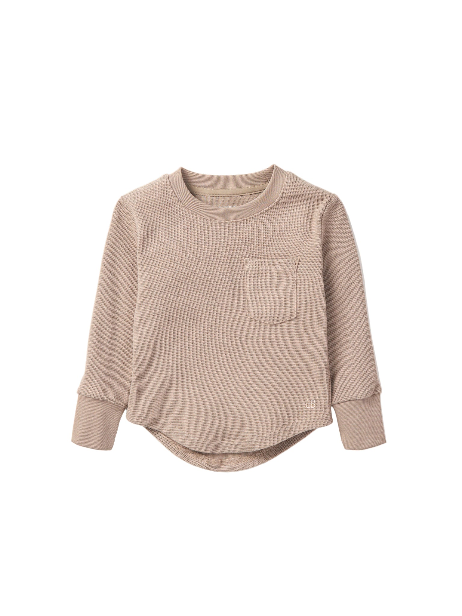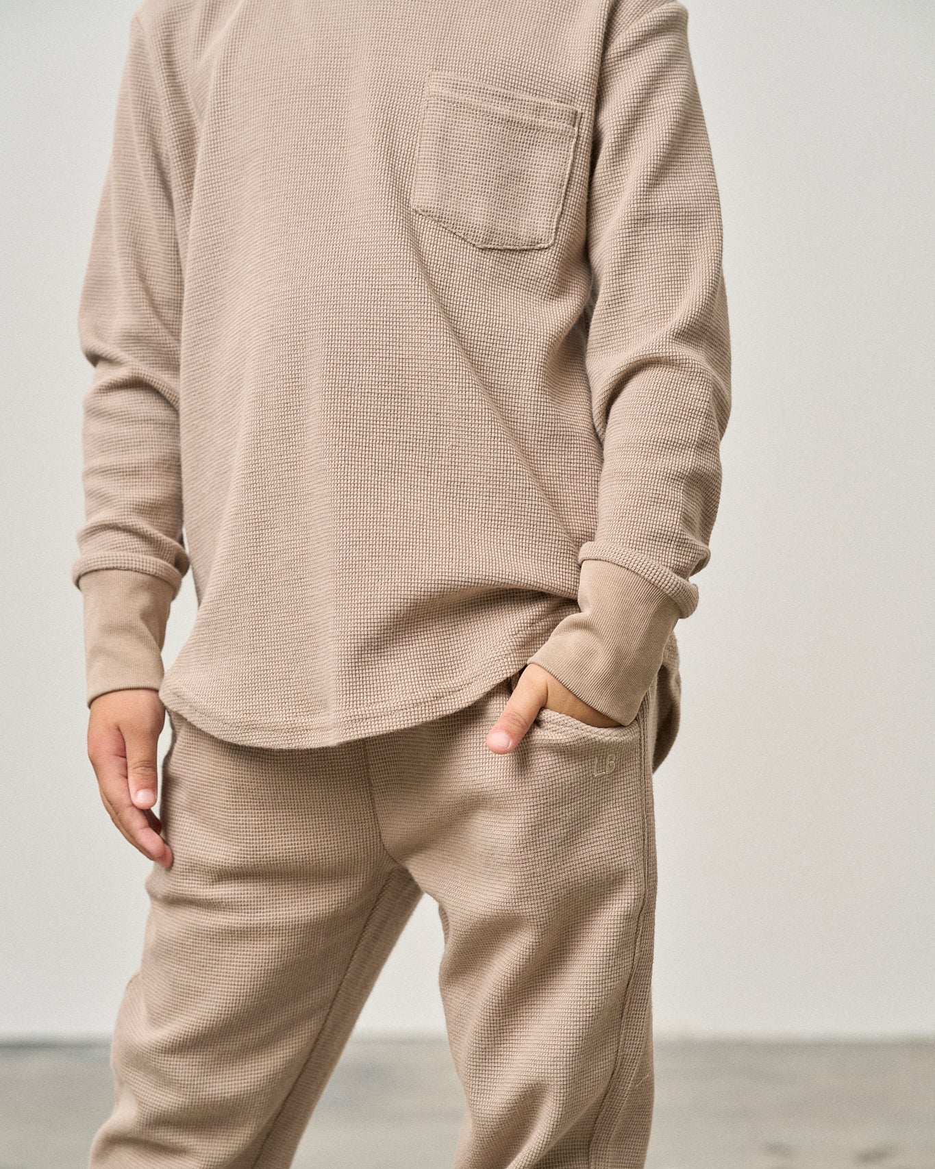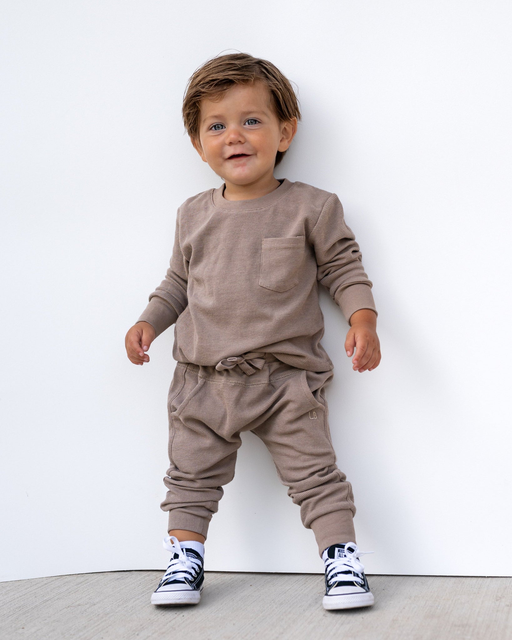Our signature Waffle is back! Available in Shadow, Mushroom and Huckleberry, this cozy long-sleeve top offers the perfect balance of comfort and style. Crafted from soft, breathable fabric, it's designed to keep your little one cozy all season long. Available in sizes from 0-3M to 12Y, it’s a versatile staple for layering or wearing solo. Pair with our matching joggers for a complete look!