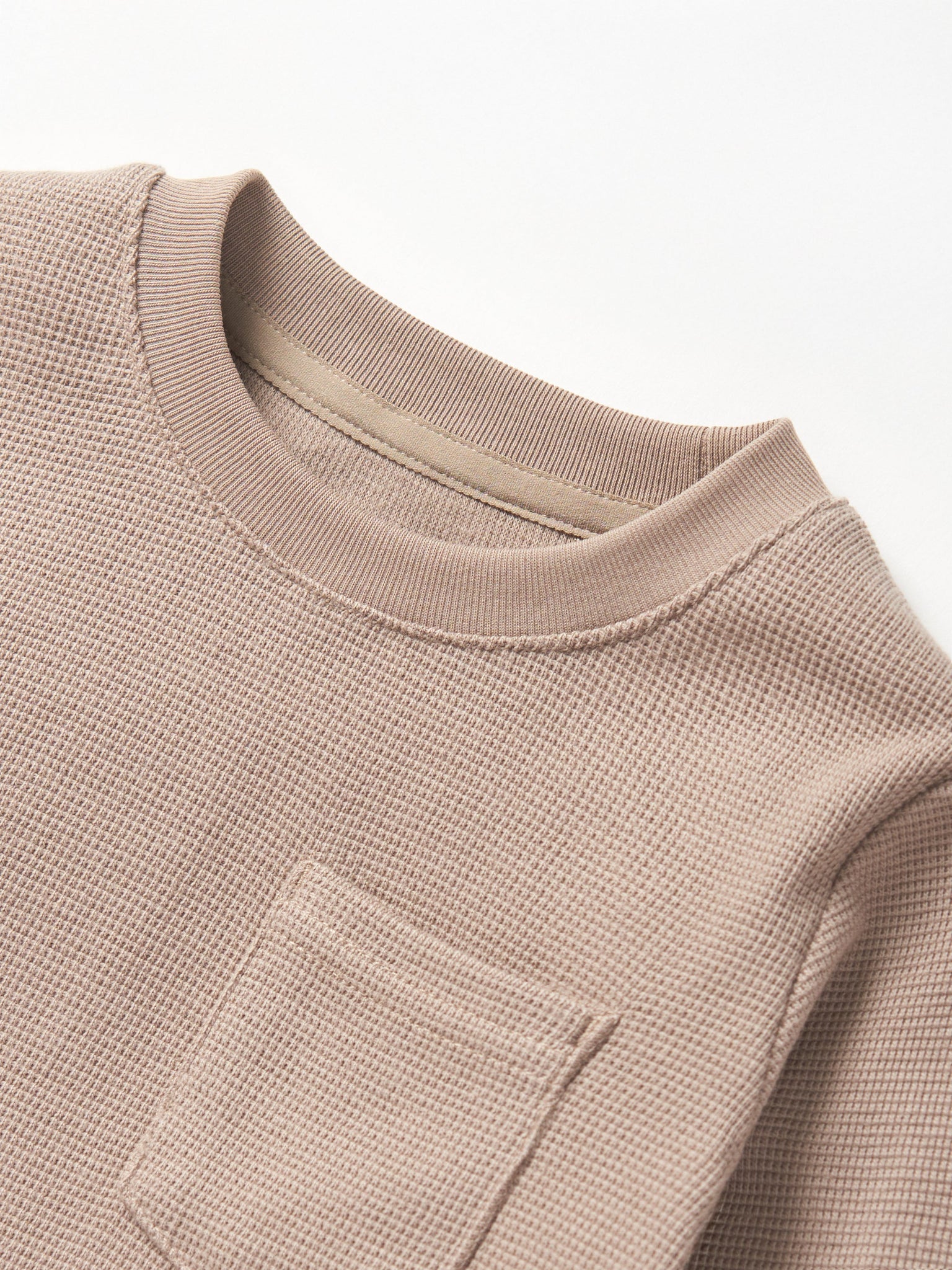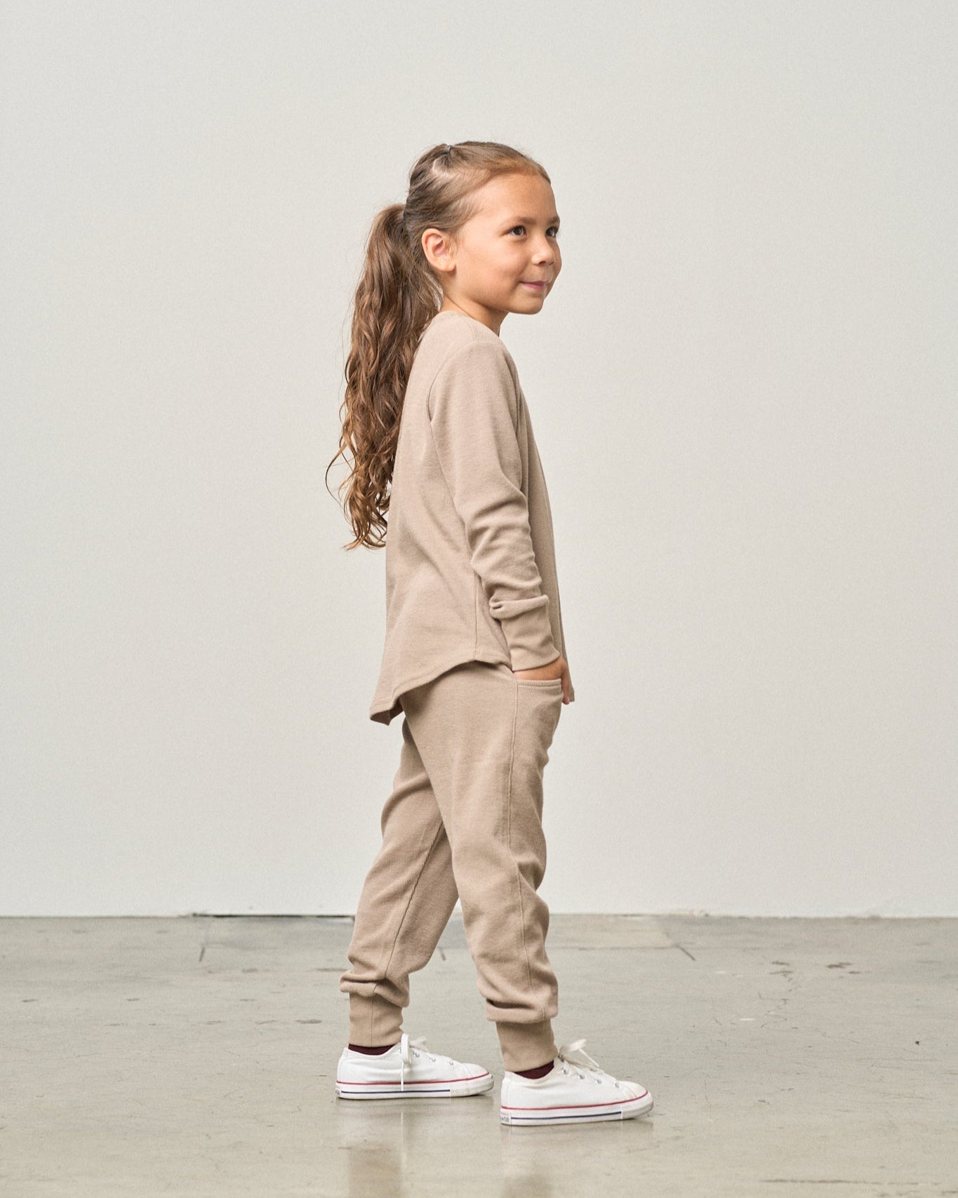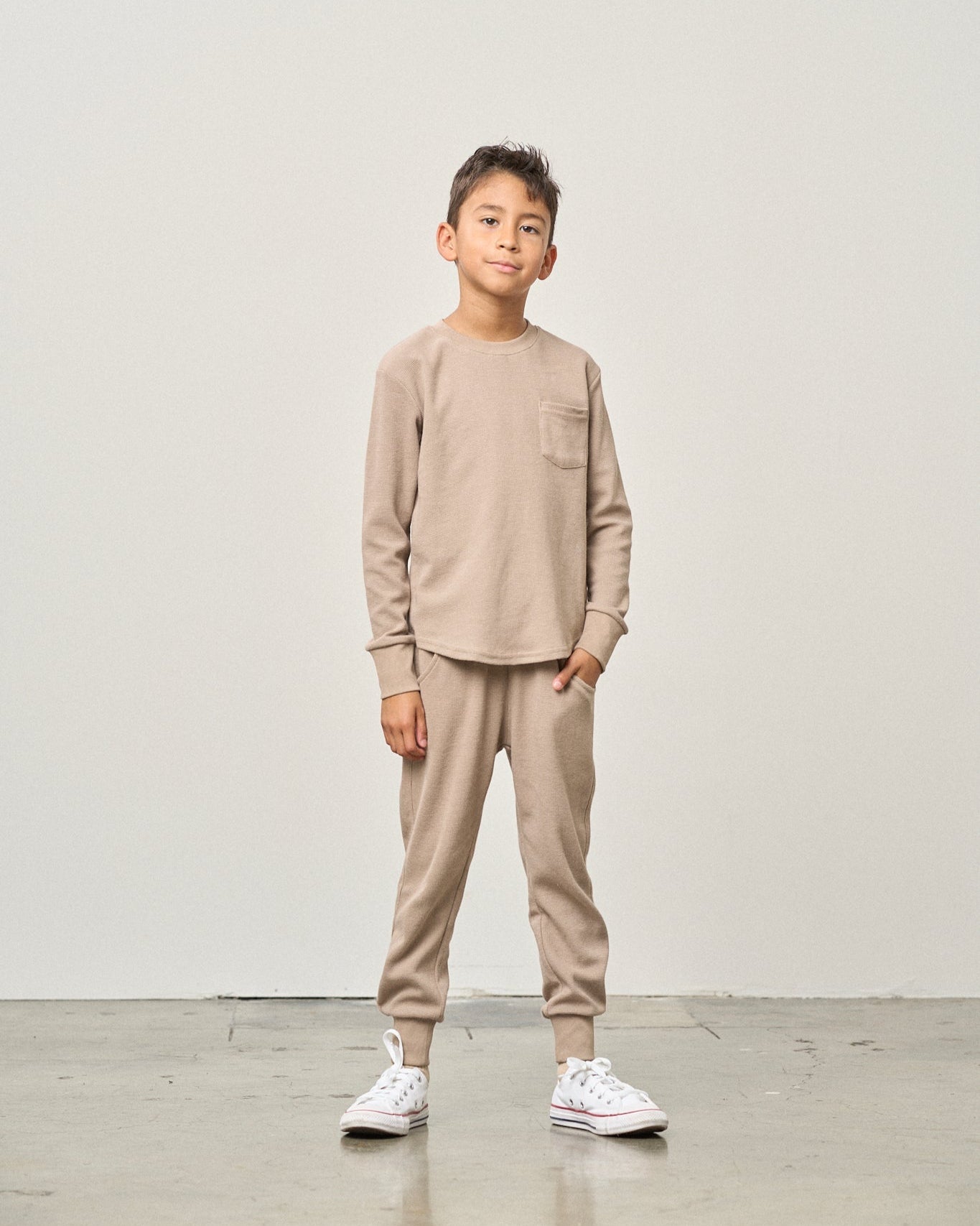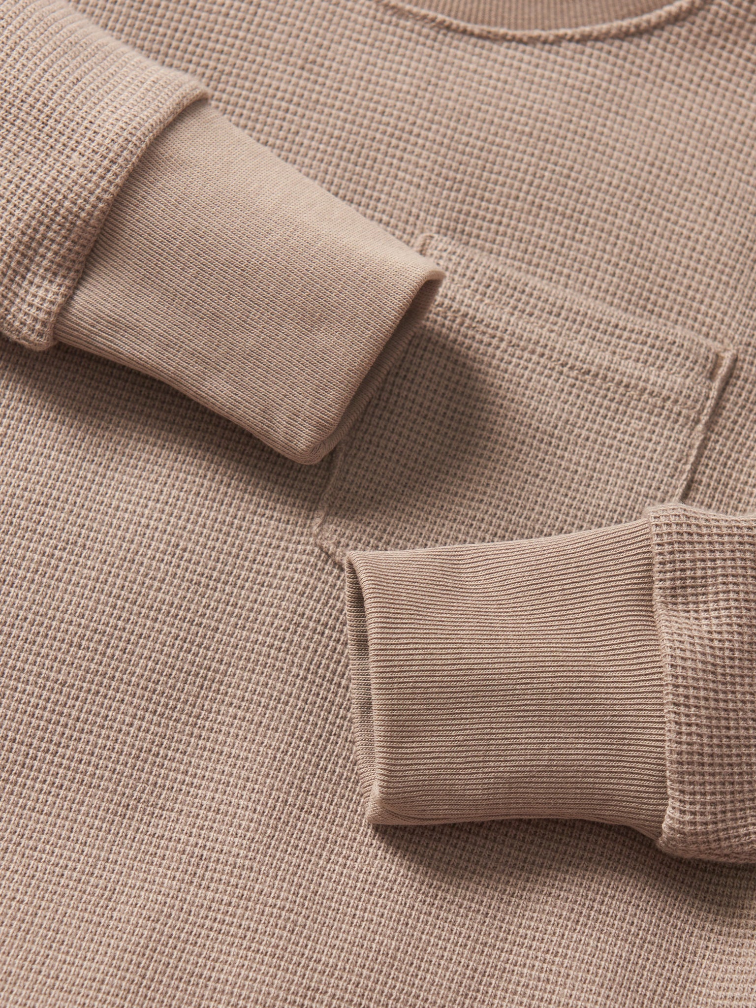 Our signature Waffle is back! Available in Shadow, Mushroom and Huckleberry, this cozy long-sleeve top offers the perfect balance of comfort and style. Crafted from soft, breathable fabric, it's designed to keep your little one cozy all season long. Available in sizes from 0-3M to 12Y, it’s a versatile staple for layering or wearing solo. Pair with our matching joggers for a complete look!